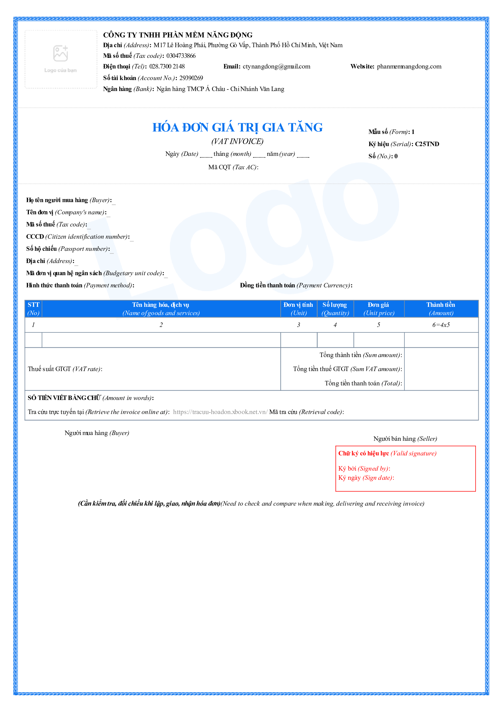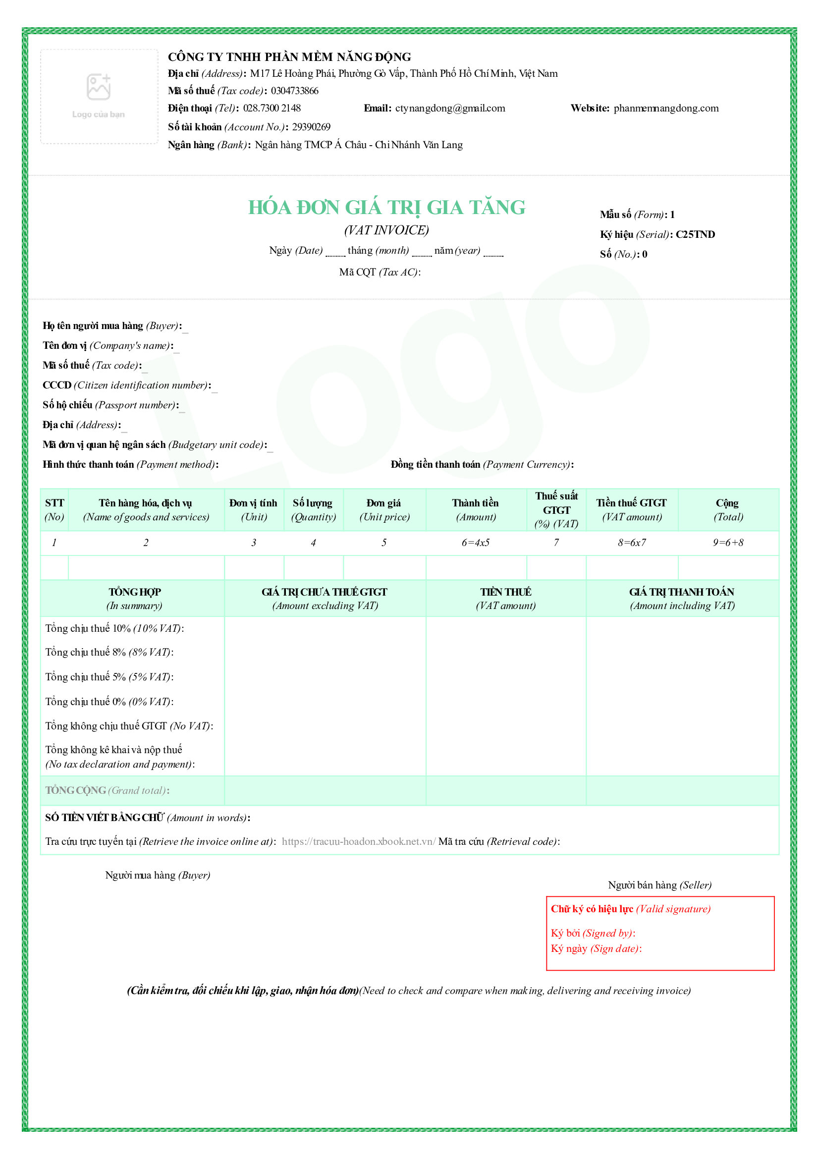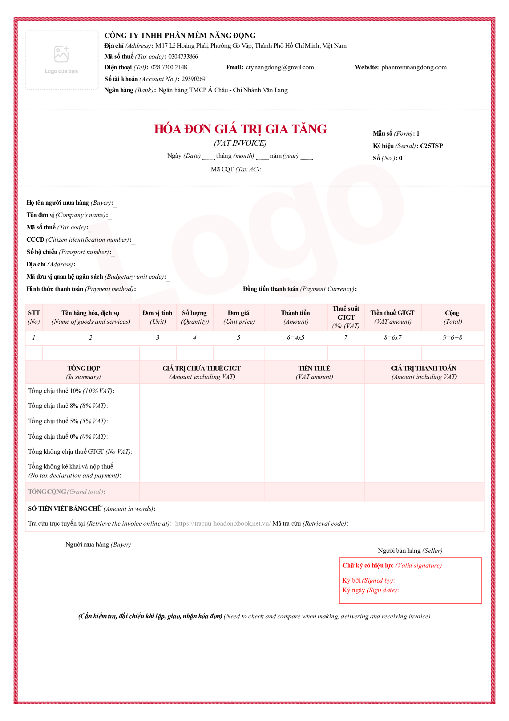- Quyền sử dụng miễn phí 1 trong những mẫu hóa đơn có sẵn bên dưới, có thể đưa Logo công ty vô hóa đơn.